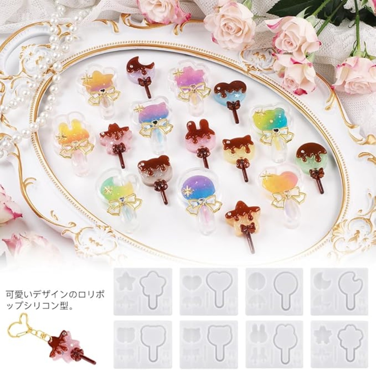 サムコス ロリポップ シリコンモールド 8個セット シャカシャカ流砂型 ハート ネコ 月 レジン シェイカーモールド シリコン モールド 鏡面 DIY 手作り キーホルダー 樹脂工芸品 アクセサリー