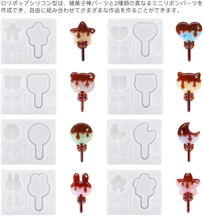 DIYに最適:ロリポップシリコン型は、糖菓子棒パーツと2種類の異なるミニリボンパーツを作成でき、自由に組み合わせてさまざまな作品を作ることができます。
