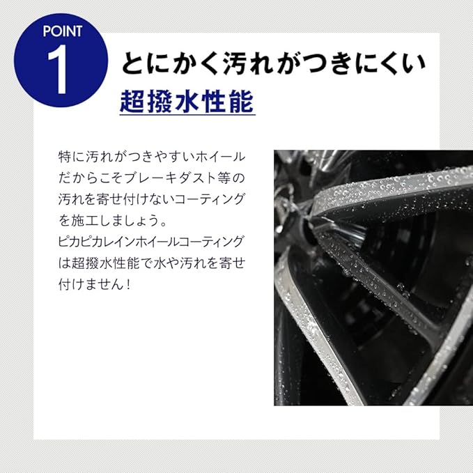 とにかく、汚れが つきにくい超撥水性能 特に汚れがつきやすいホイールだからこそブレーキダスト等の汚れを寄せ付けないコーティングを施工しましょう。 ピカピカレインホイールコーティングは超撥水性能で水や汚れを寄せ付けません!