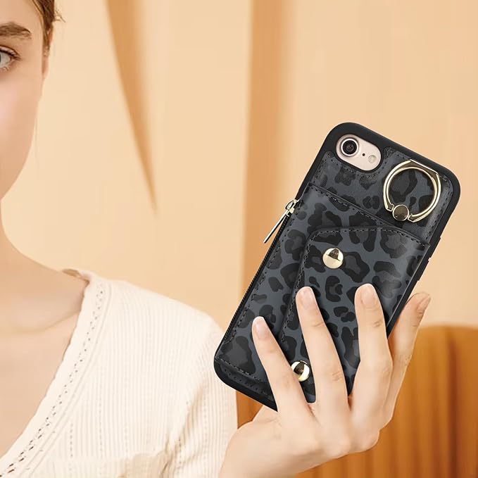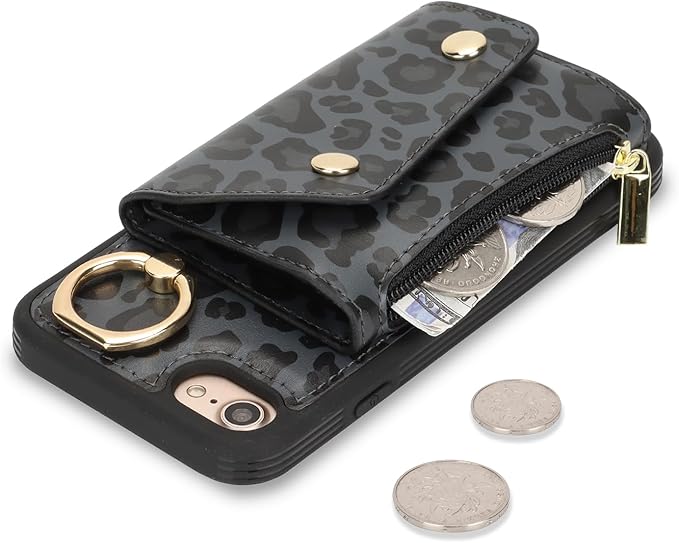 for iPhone SE 2022 / SE 2020 ケース アイホン 7 8 背面フリップ 手帳型 360 回転 Case SunYoo ICカード コインポケット ストラップ付き カード 収納 小銭入れ ファスナーポケット付き 豹柄 ヒョウ柄 ブラック