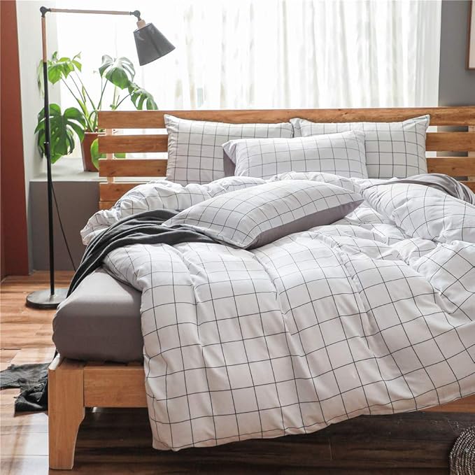NSNLGSGC 布団カバー セミダブル 4点セット 布団かばー ベットカバー ベッド用 double 白 ホワイト チェック柄 韓国 洋式・和式兼用 洗い替え速乾タイプ 防ダニ
