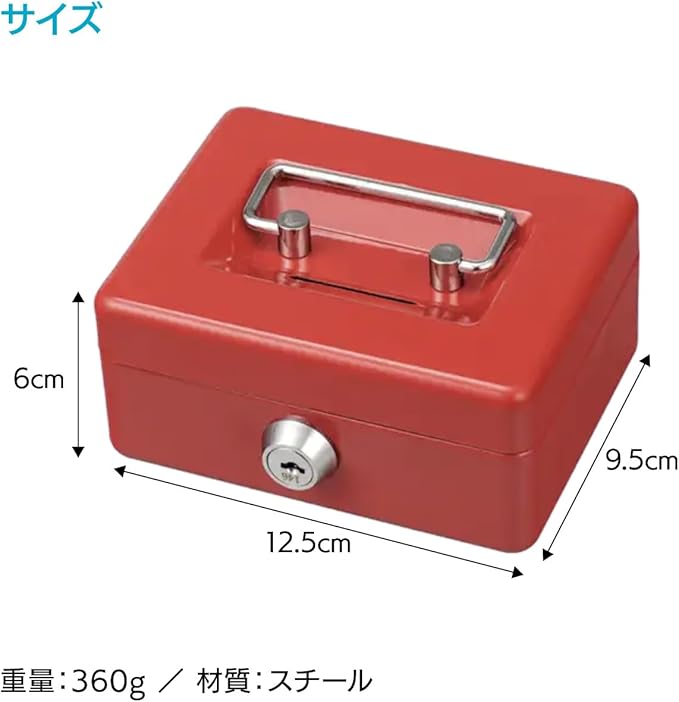 【仕様】サイズ:W12.5cm D9.5cm H6cm / 重量:360g / 材質:スチール / カラー:レッド / 鍵付き ※モニターの環境等により、色の見え方に若干差が生じる場合がございます。