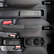 左右のシートに挟み込み、純正のセンターコンソールの上に載せます。シートを前後調整する場合はコンソールも同時に動きますので、本商品を外してから行ってください。