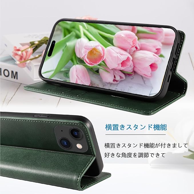 iPhone15 ケース アイフォン15 スマホケース 手帳型 携帯カバー レザー 耐衝撃 軽量 着脱しやすい 放熱性 マグネット式 カード収納 スタンド機能ケース15 対応 360度保護 PinLiSheng (グリーン, iPhone 15)