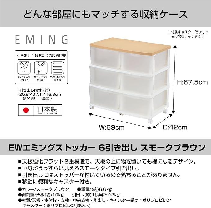 JEJ EMING(エミング) 深型ストッカー6引出し キャスター付き スモークブラウン 天板強化フラット二重構造 (1個組) EW-EM-6(SBR)
