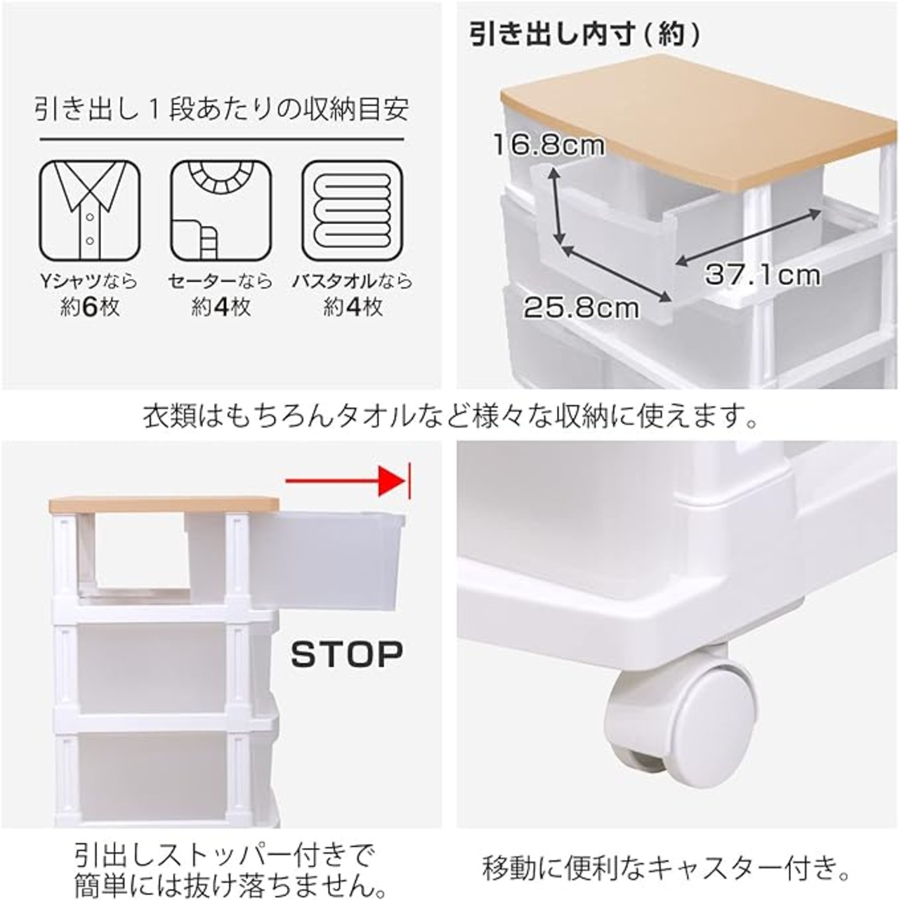 1段あたりの収納目安 Yシャツ4枚 セーター2枚 バスタオル4枚 二重構造と補強を施し耐荷重10kgを実現させたプラスチック製強化天版採用。 天板の表面はフルフラットにしている為、安定して物を置くことが出来ます。 また。プラスチック製なので汚れてもサッと拭けばすぐ取れて、いつでも清潔にお使い頂けます。 更に引出しはスリガラス調の半透明タイプでとっても素敵な商品に仕上がっています。 クローゼットや押入れの中での使用以外、リビングでも十分お使い頂けるフォルムとなっております。