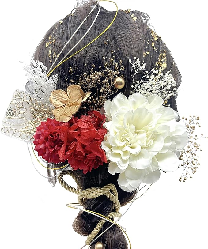 髪飾り 成人式 前撮り ダリア 卒業式 入学式 ゴールド カスミ草 ロープ タッセル 和玉 ロープアレンジ ドライフラワー 振袖 袴 赤 白 黒 グレー ウェディング 結婚式 白無垢 和装 プリザーブドフラワー アジサイヘアアレンジ ショートヘア ハーフアップ ロングヘア A24110001-03