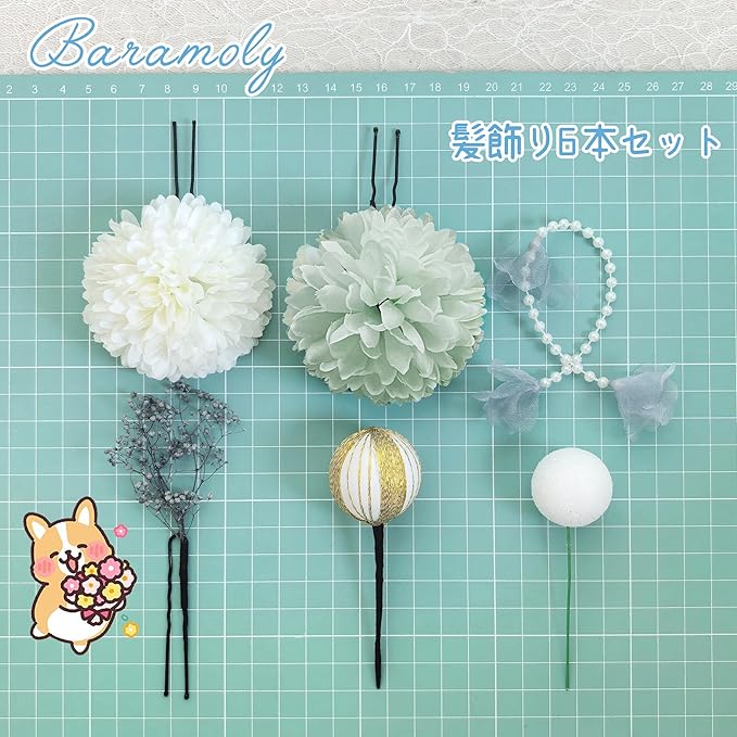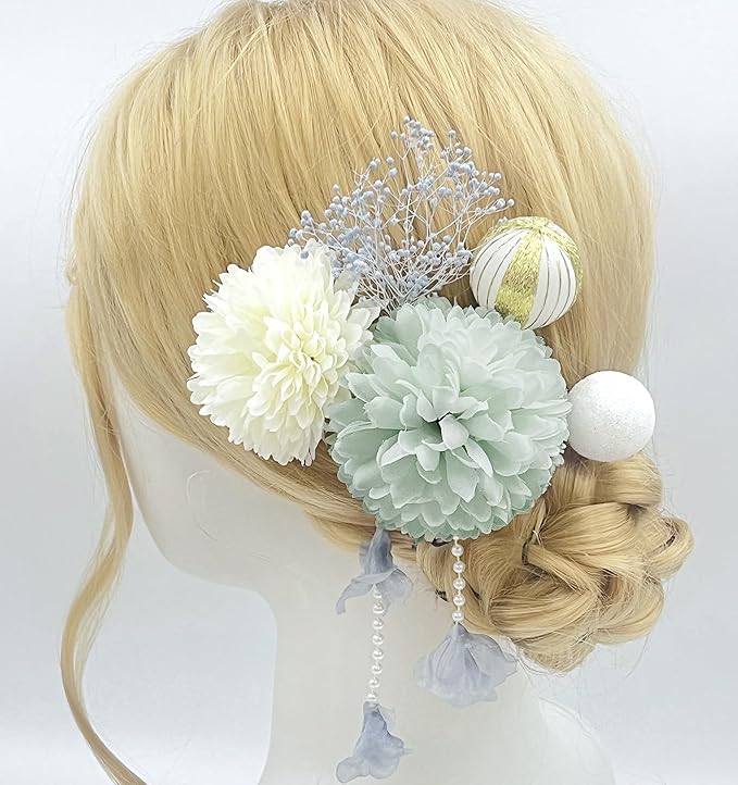 【華麗な6本セット】このヘアアクセサリーはピンポンマム、パールビーズチェーン、かすみ草、和玉などを使用しており