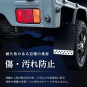 ✅素材はゴムではなく硬い丈夫な素材を使用しておりますので、柔軟性はありません。 【耐久性】高品質な素材を使用し、長期間の使用に耐える耐久性を備えているマッドガードです。 【保護機能】車輪から飛び散る泥や砂、小石などを効果的に防ぎ、車体や周囲の車両・人に汚れやダメージを与えません。泥除けとしての機能を果たします。 【設置簡単】付属のボルトで軽トラックの車体に簡単に取り付けられ、取り外しも容易です。軽トラックの多くのモデルに対応しています。 【スタイリッシュデザイン】車体と調和するデザインで、軽トラの外観を美しく保ちます。軽トラのカスタムパーツとしてご利用頂けます。 【注意事項】取り付け前に、車両の取扱説明書を必ず確認し、適切に取り付けてください。製品は泥や砂などの飛び散る物質を防ぐ目的で設計されていますが、完全な保護を提供するものではありません。運転時には安全を確保するために適切な注意を払ってください。