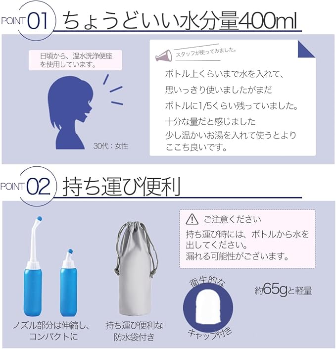 【携帯タイプ】場所を選ばず給水すればどこでも使用可能です。アウトドアや海外旅行などには必携です。またシャワートイレの設置がない屋内でも重宝いたします。介護や育児のおむつかぶれ対策としてもご使用いただけます。【軽量】約70gの小型設計ですので、旅行やアウトドアなど様々なシーンで活躍。防水巾着袋付ですので、収納して楽に持ち運びができます。【大容量400ml】大きすぎることなく、ペットボトルサイズなので女性でも片手に持って使用することができます。握る力によって水圧をコントロールできますので、お好みの水圧でご使用ください。【2つのノズル】使用用途やお好みに合わせてノズルを交換可能。【簡単お手入れ】水洗いで簡単にお手入れすることができます(40度以下のお湯を使用してください)。