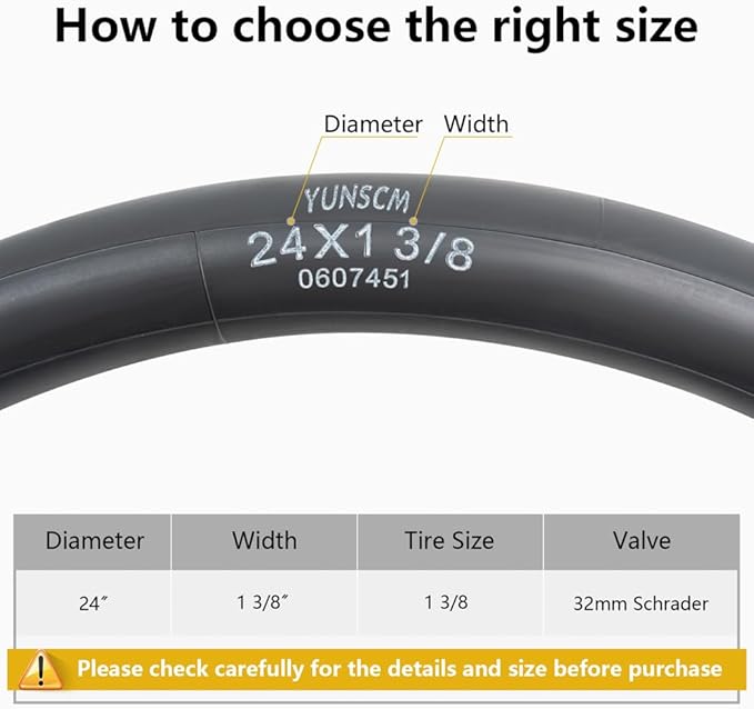 ✅【24“x1 3/8自転車チューブ】:24x1 3/8の自転車,米式バルブ32mm に適しています。ほとんどのロードバイク、マウンテンバイクに適しています。チューブのエアインテークは,オートバイや自動車と同じ仕様です,簡単にエアーを入れることができ楽でした。車で使っている空気圧計がそのまま使えるようになり、空気圧の管理がとても簡単になりました。注意:購入前にタイヤサイズをチェックしてください。タイヤサイズは通常、外タイヤ側面に表示されます。