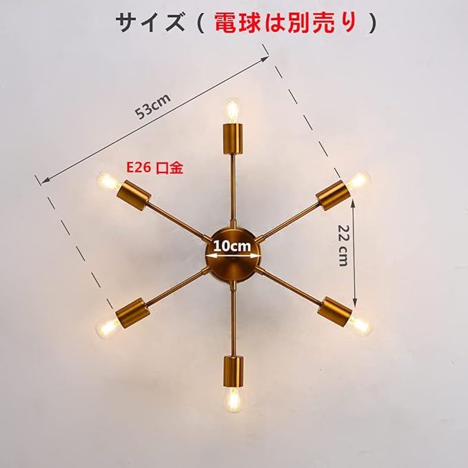【ゴールド銅色の本体】ペンダントライト6灯は高品質の金属で作られている、高級なゴールド銅色、お値段以上の幸福感をきっともたらしてくれます。サイズ:約53 53 15cm「定格電圧」85-250V「重量」約1.2kg。電球対応:E26(電球は付属しません)日本説明書付き。