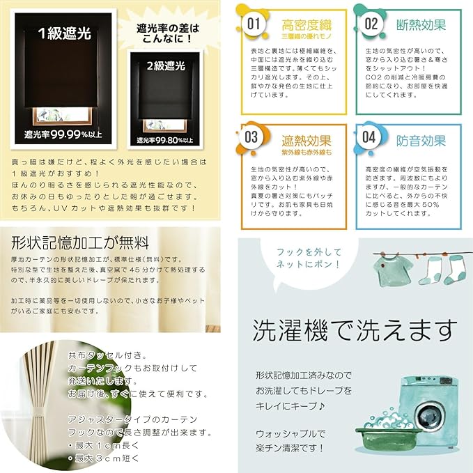【1級遮光】遮光率99.99%です。※どのお色も1級遮光ですが、色の濃淡により1級遮光を感じにくい場合があります。遮光を重視されたい場合は「ブラック、ブラウン」がオススメです。