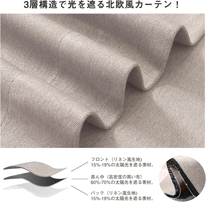 99.99%以上の遮光効果:高品質なリネン風生地を使用し、三層構造で仕立てたカーテンは、遮光率99.99%以上を誇ります。強い日差しをしっかり遮断し、昼間でもカーテンを閉めるだけで室内がすぐに暗くなります。静かな睡眠環境を求める方に最適で、睡眠の質を向上させるお手伝いをします。また、外からの視線を遮り、プライバシー保護にも優れています