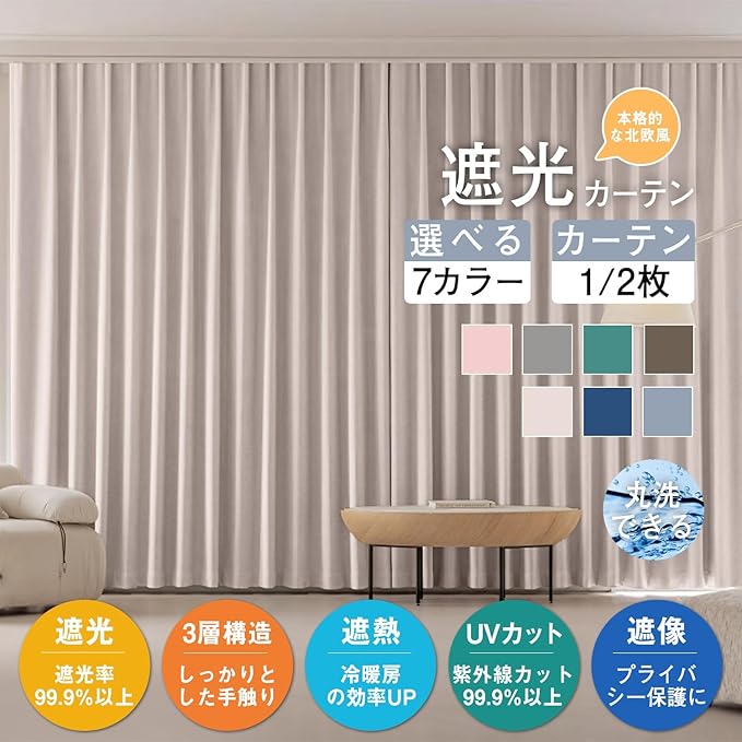 断熱・保温機能:このカーテンは、断熱率34.2%以上、保温率28.9%以上という優れた温度調整機能を備えています。冬は冷気の侵入を防ぎ室内の暖かさを保ち、夏は外の熱気を遮って涼しさをキープ。季節を問わず快適な室内環境を実現し、冷暖房効率も向上。省エネにもつながる、環境にやさしい選択です