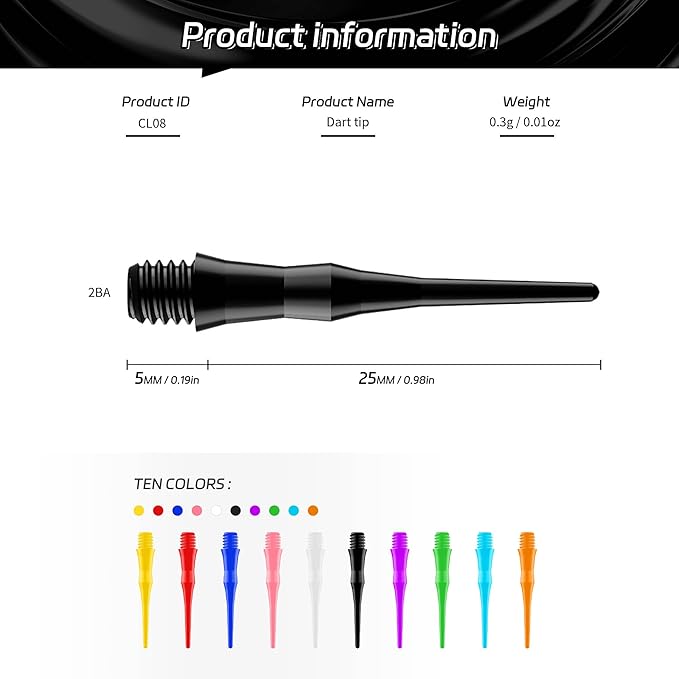 サイズ:ダーツ先端のプラスチックの長さ25 mm、1セット500点、10色(イエロー、レッド、ダークブルー、ピンク、ホワイト、ブラック、パープル、グリーン、ライトブルー、オレンジ)を含む。