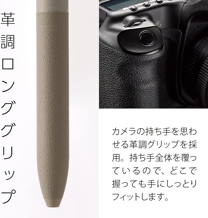 心地よく静かなノック感で使う人や環境に調和する、新しいなめらか油性ボールペン。カメラの持ち手にも使われる革調のロンググリップを採用しており、筆記時の安定感も抜群です。シンプルながら個性のあるシルエットは流行に左右されず、男女関係なく使う人になじみます。