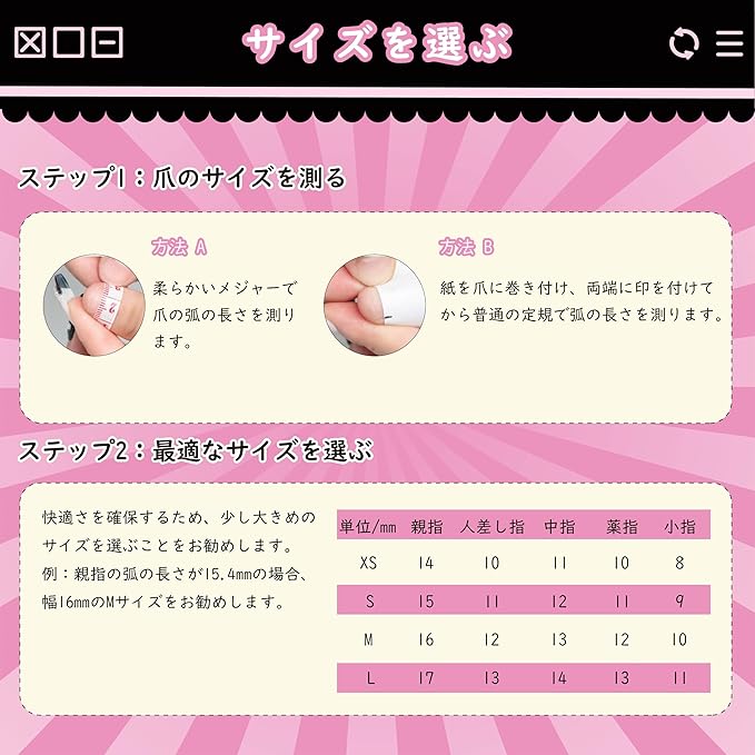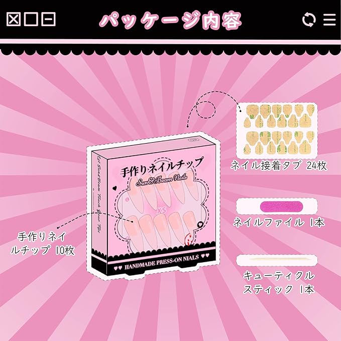 【パッケージ仕様】 ネイルチップ 10枚、爪用両面テープ24枚、ネイルリムーバースティック1本、爪やすり1個、マニキュアスティック1本も付きます!※サイズの測定方法と選択方法については、製品画像を参照してください。※最良の結果と再利用性のために、下記で推奨されているジェリーグルーを使用することをお勧めします。