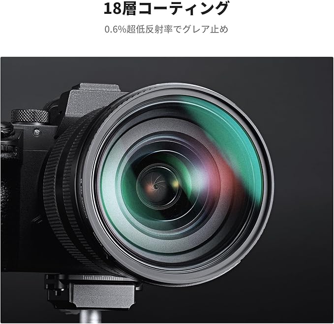 【両面18層ナノコーティング】レンズフィルターの光学ガラスは両面18層ナノコーティングを採用し、フィルター表面の反射を効果的に低減し、乱反射を起こしゴーストなどを抑えられる。ブラックミストフィルターの表面には防カビ・防水コーティングを施し、水や油で汚れても簡単に拭き取れ、日頃のメンテナンスを簡単にする。