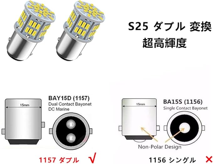 【 S25 LED ダブル 】ダブル、1157A BAY15D 1016 1034 1154 2057 2057A 2357 2357A 2357NA 2397 3496 3497 7528 ホワイト 、DC12-24V対応可,極性。マルチアプリケーション:ターンシグナルライト、バックアップリバースライト、テールライト、コーナーライトなどに使用します。