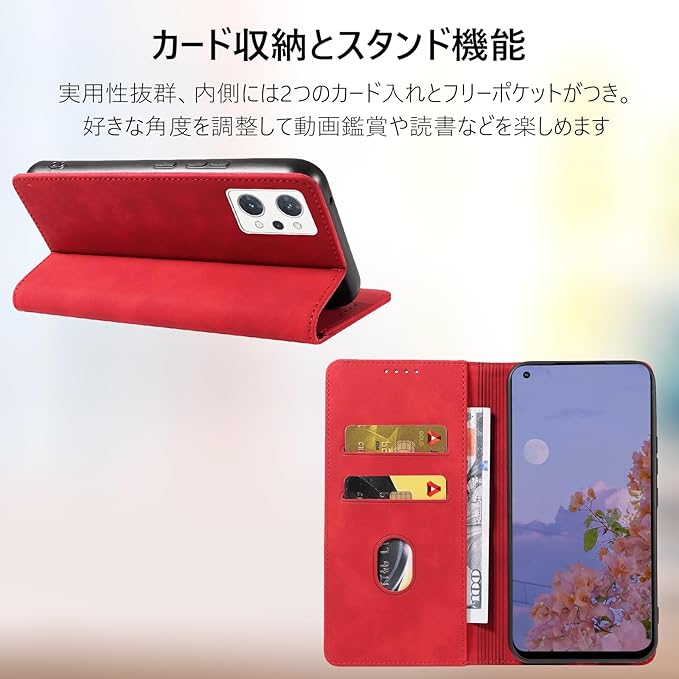 KWATUNG oppo reno7a 9a 手帳型 ケース oppo reno7 a ケース 手帳型 おしゃれ 肌感レザー oppo reno9 a ケース 手帳型 内蔵マグネット 耐衝撃 oppo reno7a スマホケース カード収納 スタンド機能 おっぽ スマホ reno7 a reno9 a ケース 全面保護【6.4インチ】レッド