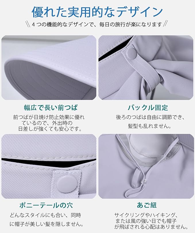 【ポニーテール穴・あご紐付き】背面には縛った髪を出す穴があり、ポニーテールの女性におすすめです。炎天下のアウトドアには紫外線対策できる完全遮光 帽子。あご紐付きのuv カット帽子は、頭周りのフィット感を調整でき、風に飛ばされにくくアウトドアや自転車でも安心。