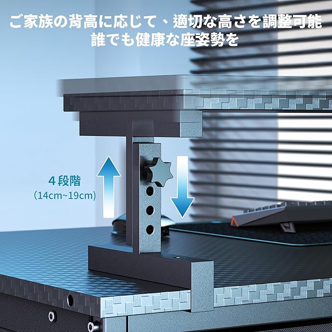 【4段階調整なモニター台】ダイヤルを回すだけでモニター台を13~19cmの4段階調整することができます。家族成員皆の目線に応じて、いつも正しい座姿勢を保ちます。