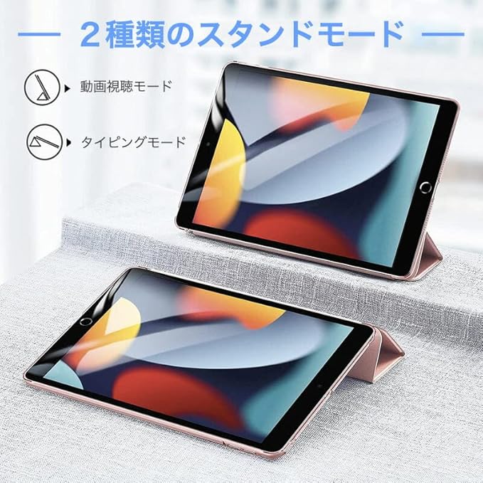 【安定したスタンド機能】 フロントカバーに内蔵された複数のマグネットにより、安定したスタンド機能をご利用いただけます。 タイピングや動画視聴などiPadを立ててご使用の際に、とても便利にご利用いただけます。