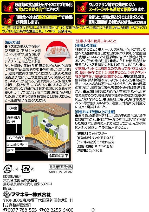 最速2時間(薬剤を食べてから中毒症状が発現し始める時間)で効く ・警戒せずによく食べるマイクロカプセル処方 ・ニオイを閉じ込めて食いつき4倍(マイクロカプセル化有無の喫食量比較。フマキラー試験結果) ・スーパーラットも退治