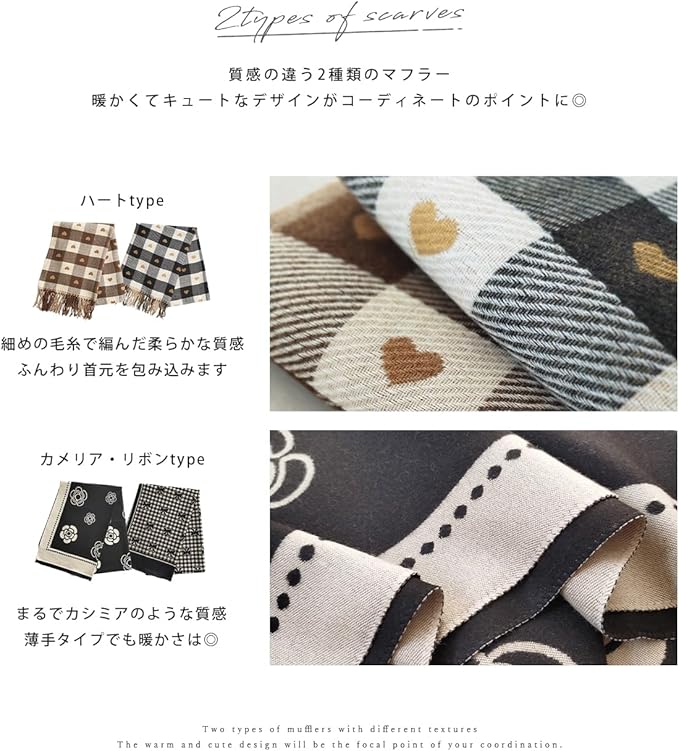 質感が違う2種類のマフラー。 首元からしっかり暖かく、ふんわりと心地よく着用頂けます。