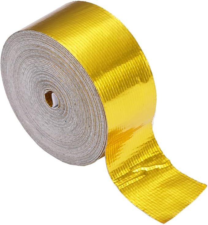 粘着ヒートシールド テープ 耐熱 耐熱性 遮熱 反射 ボディ マフラー フロントパイプ エキマニ エンジン タンク ホース バイク 車 パーツ ドレスアップ 配線 腐食防止 損傷 溶解 耐電圧 防止 電線 接続部 絶縁 保護 補強 幅25mm 長さ9m (ゴールド)