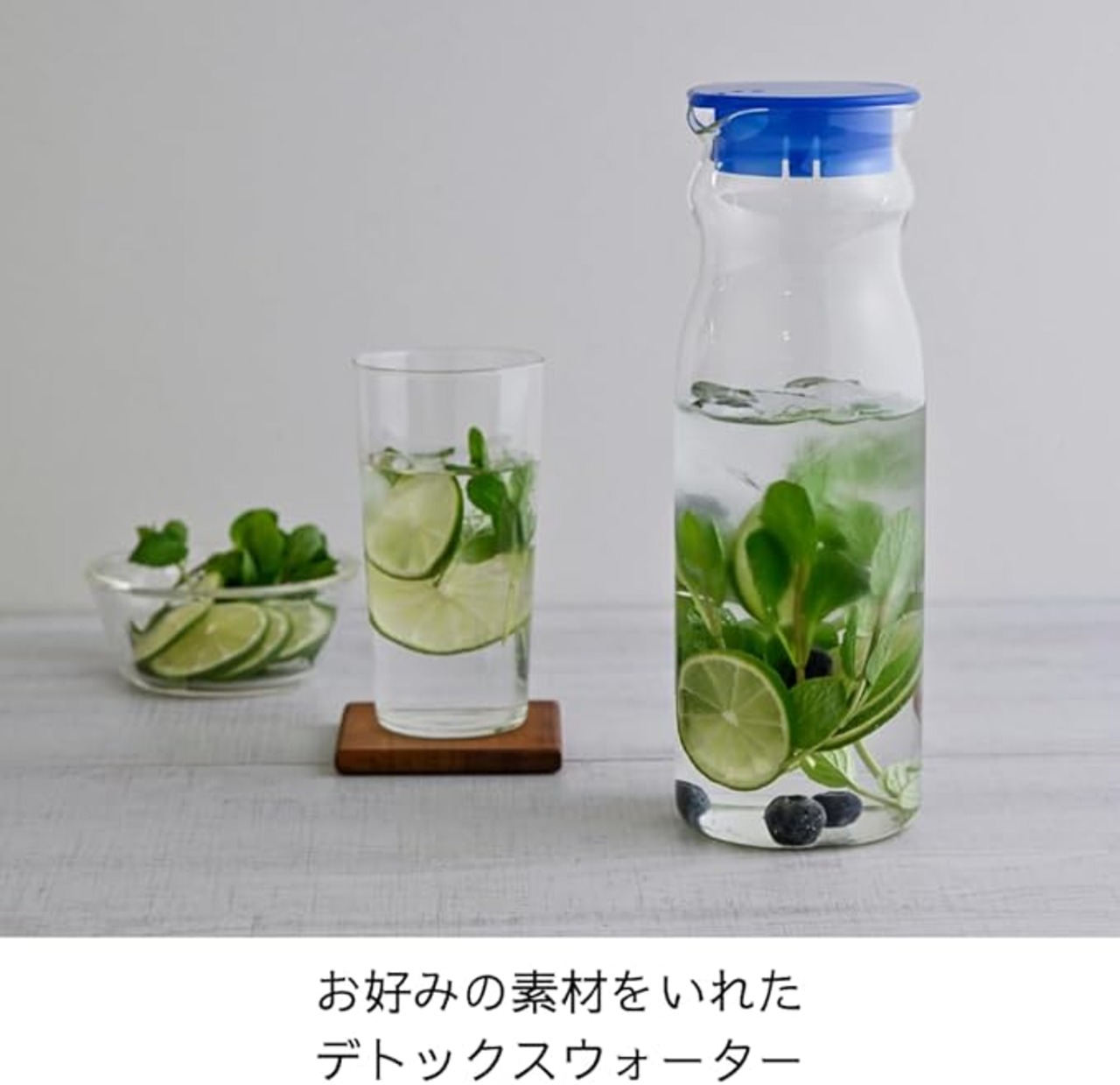 直径9cmの冷蔵庫ドアポケットに入るサイズです。2本セットなので麦茶と緑茶で分けて作ったり、日ごとに分けたりと便利な使い方ができるセットです。本体上部がくびれ形になっているので、持ちやすく注ぎやすいです。くびれの上までで、1200mL入ります。本体は耐熱ガラスでできているので、熱湯の使用も可能です。フタもポットも食器洗い乾燥機での使用が可能なのでお手入れも簡単です。