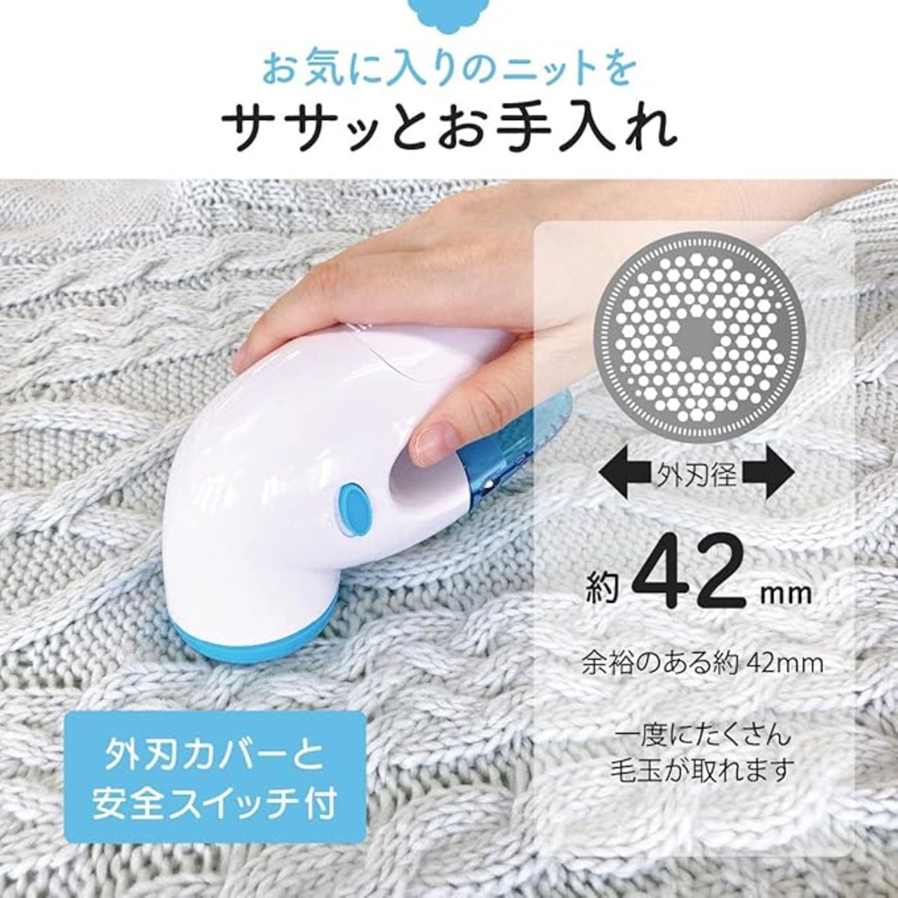 【 特 長 】 ◆しっかり握れるスリムグリップ ◆余裕ある約42mm外刃で一度にたくさん毛玉が取れます ◆安全スイッチ付きで外刃を外した状態のときは電源が入りません ◆保管時も安心、外刃カバー付き ◆着脱式でお手入れ簡単な毛玉収納ケース ◆単3乾電池2本使用(電池別売)