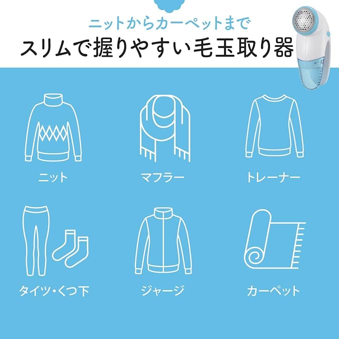 ●しっかり握れるスリムグリップ ●余裕ある約42mm外刃で一度にたくさん毛玉が取れます ●安全スイッチ付きで外刃を外した状態のときは電源が入りません ●保管時も安心、外刃カバー付き ●着脱式でお手入れ簡単な毛玉収納ケース ●単3乾電池2本使用(電池別売)