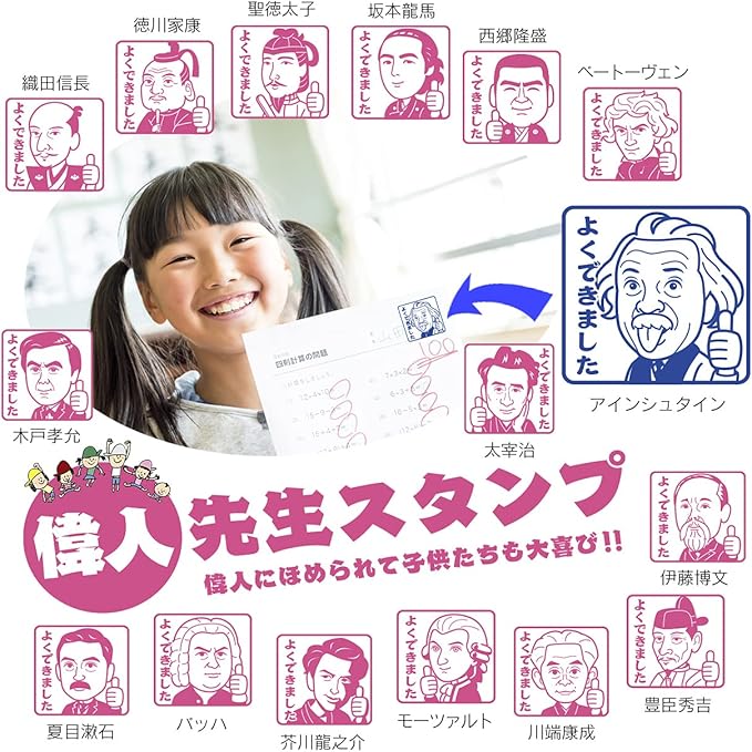 世界の物理学者、ガリレオ・ニュートン・アインシュタインをモチーフにした評価ゴム印です。