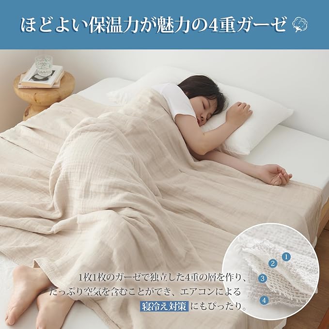 【癒しの肌触り】綿100%天然素材で仕上げたもので、子供や敏感なお肌の方にも安心してご使用いただけます。ガーゼ生地を4重にしたことでやわらかい肌触りと、快適な寝心地を作ります。