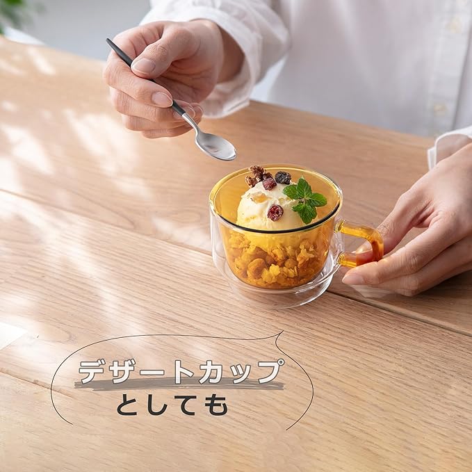 耐熱ガラス製のダブルウォールマグカップ。きれいなカラーリングがテーブルを彩ります。