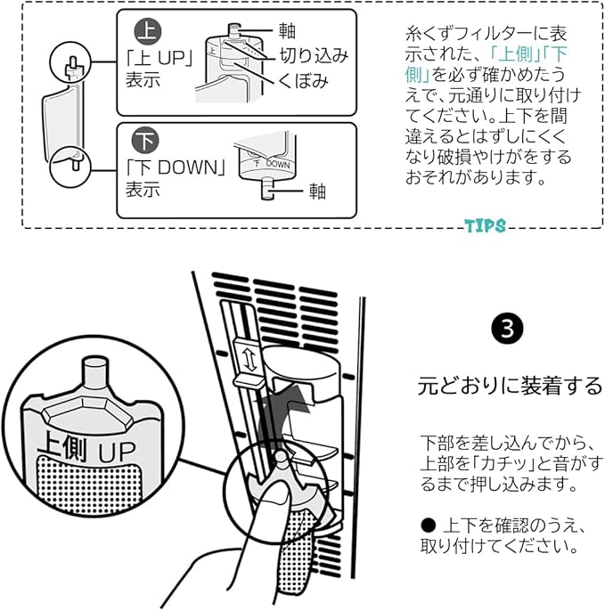 【設置簡単】es-lp2 糸くずフィルター上部のつまみの奥を強く押し下げて、上部の軸をはずしながら手前に引き出します。逆に下部の軸を穴に差し込み、上部のつまみを押し下げながら上部の軸を押し込んで取り付けは完了となります。