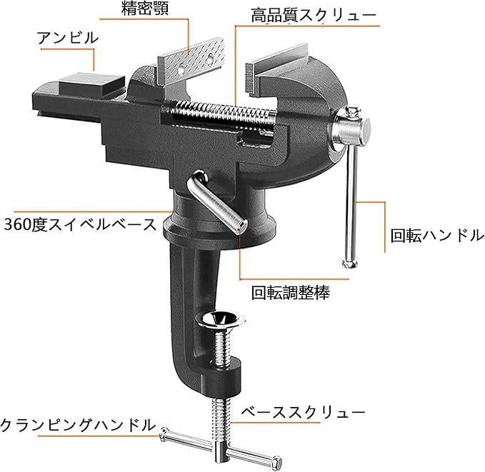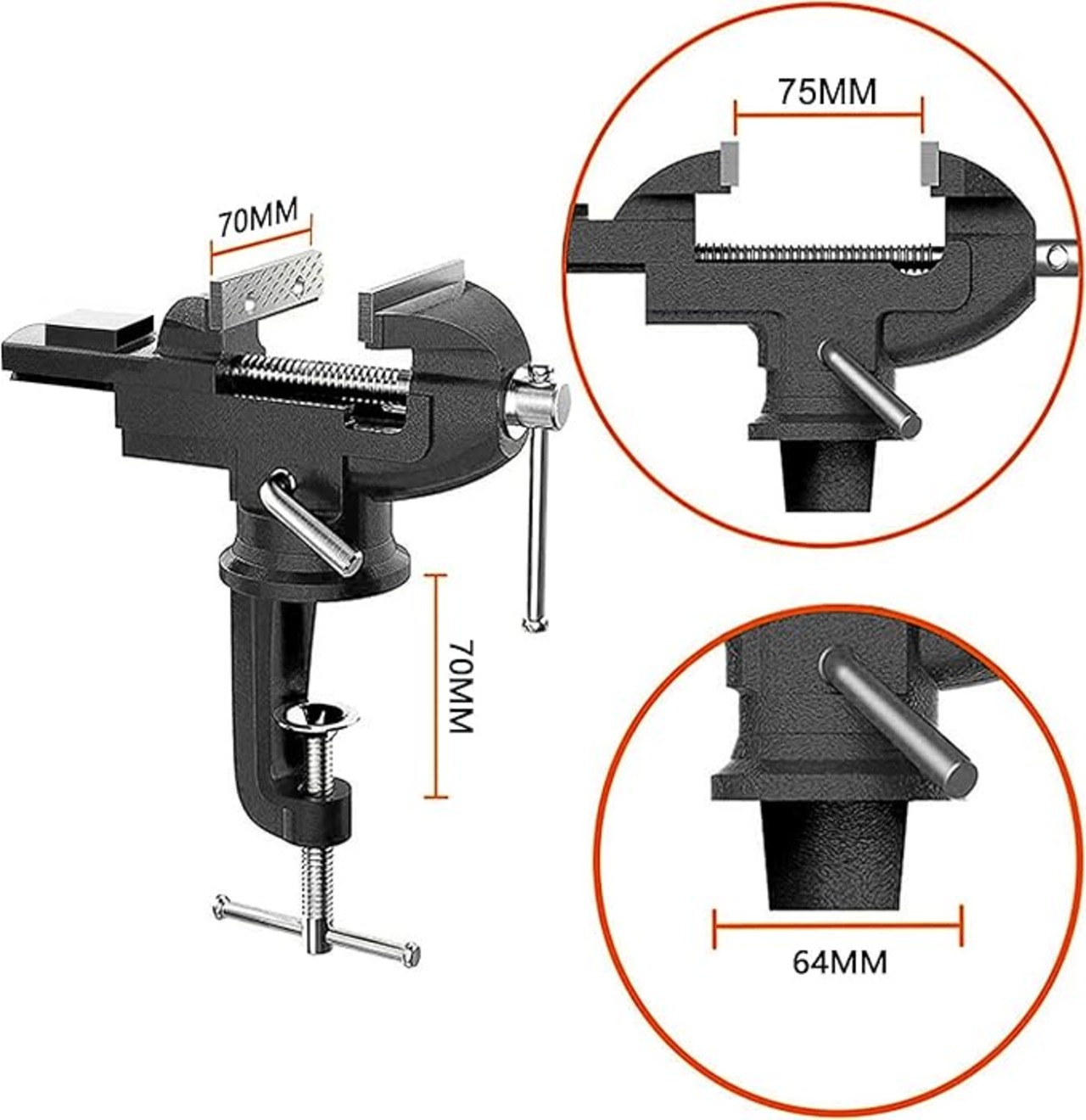最大開口75mm 小型卓上万力 360 回転盤付き ベンチバイス クランプ 鋳鋼製 携帯用作業台 木工 導管 穴あけ 金属加工 (黒いスーツ)