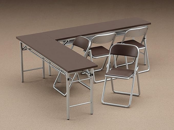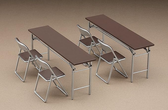 「学校の机と椅子」に続く、第2弾!折畳式会議机(H:61.5mm、W:150mm)と折畳式パイプ椅子(H:65.6mm、W:39.6mm)の組立キットが登場。机2卓と椅子4脚のセットで、接着剤不要で組み立て可能です。成形色はマホガニーとグレーの2色で、塗装しなくても雰囲気ある仕上がりになります。厳密なスケールモデルではなく、1/12可動フィギュアにフィットする様に寸法は アレンジしてあります。※製品を折畳むことは出来ません。