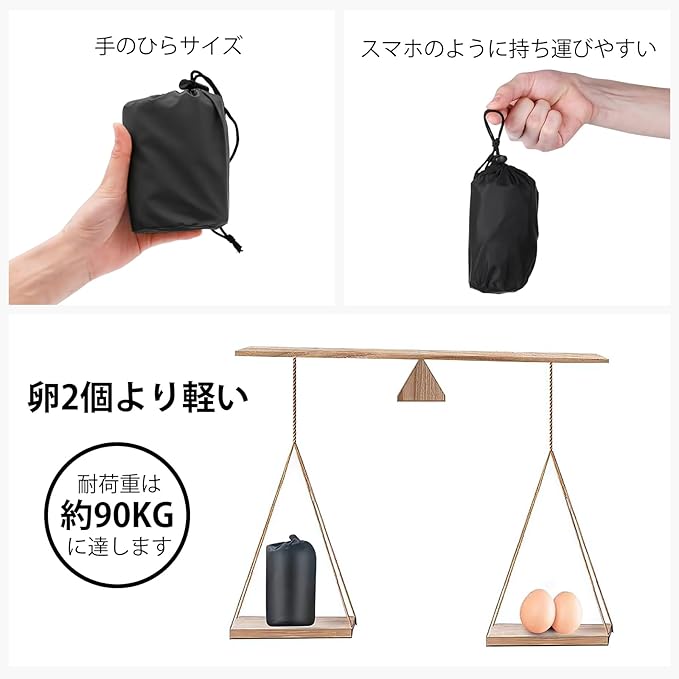 【超コンパクトで携帯性抜群】このエアーレジャーシートは、手のひらサイズ(約13 6 5cm)で、卵2個よりも軽い85gという驚異的な軽さです。耐荷重は約90kgに達するにもかかわらず、バッグやポーチに簡単に収納できるので、どこへでも気軽に持ち運ぶことができます。例えば、登山や釣り、旅行など、荷物を最小限に抑えたいシーンで大活躍。普段使いにもピッタリで、電車や飛行機での移動中も快適な座り心地を提供します。
