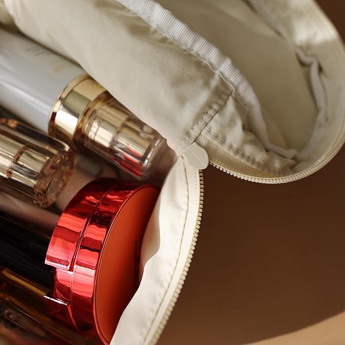 【大きな開口部】開口部が大きく開くジッパーを採用しているため、フラップを裏返して使うことができ、アイテムの出し入れが簡単にできます。ポーチのボディは円筒形デザインで、さまざまなスキンケア製品やメイクアップ製品を縦向きに収納でき、中身を衝突や傷から守ります。