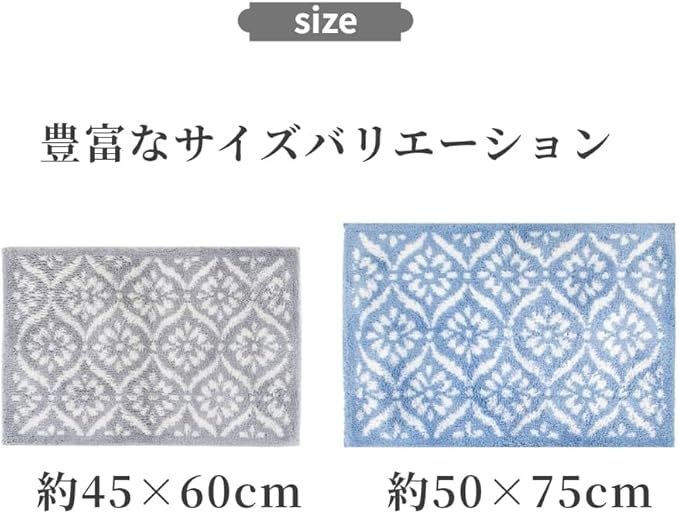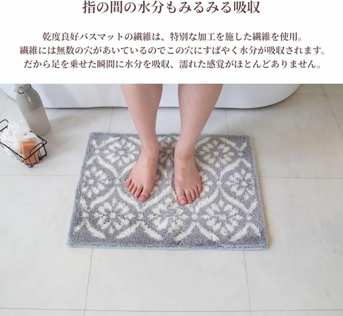 乾度良好バスマットシリーズから女性に人気の高いエレガントな雰囲気の「ボーテ」が誕生。 足元から華麗で優美な演出を楽しむことができます。 乾度良好バスマットの繊維は、特別な加工を施した繊維を使用。繊維には無数の穴があいているのでこの穴にすばやく水分が吸収されます。 だから足を乗せた瞬間に水分を吸収、濡れた感覚がほとんどありません。 乾度良好シリーズは無数の穴から水分だけではなく空気も取り込みすばやく拡散、あのイヤなヒンヤリ感がありません。