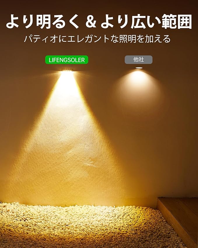 【最適な明るさのソーラーガーデンライト】このフェンスライト300ルーメンの柔らかな暖色光。フェンスや階段の段差を自然に浮かび上がらせ、目が疲れない快適な照明環境。明るさセンサー搭載で、日没から夜明けまで自動点灯、日中は自動消灯。
