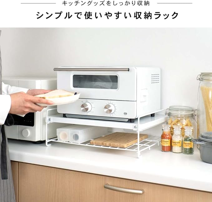 【特長】<br>●キッチンカウンターやレンジの上などに小物をスッキリ収納<br>●耐熱シリコーン製すべり止めキャップ仕様(耐熱 約200℃)<br><br>【仕様】<br>●製品寸法(約):幅42.5 奥行31.5 高さ15(cm)<br>●材質<br> 天板・網棚・フレーム:スチール・エポキシ樹脂粉体塗装<br> 樹脂部品:シリコーンゴム<br> ネジ:スチール(メッキ)<br>●耐荷重:10kg(天板7kg/網棚3kg)<br>※耐荷重は測定値であり、保証値ではありません。<br><br>