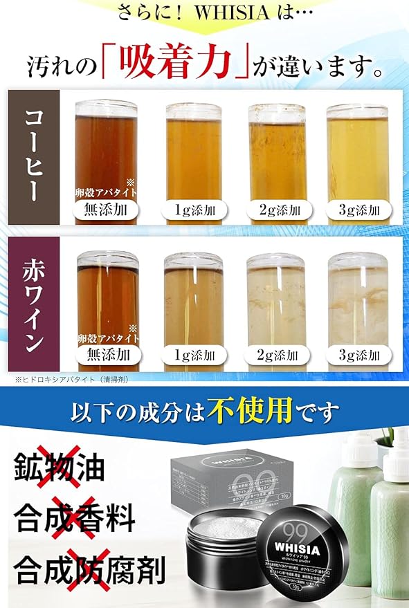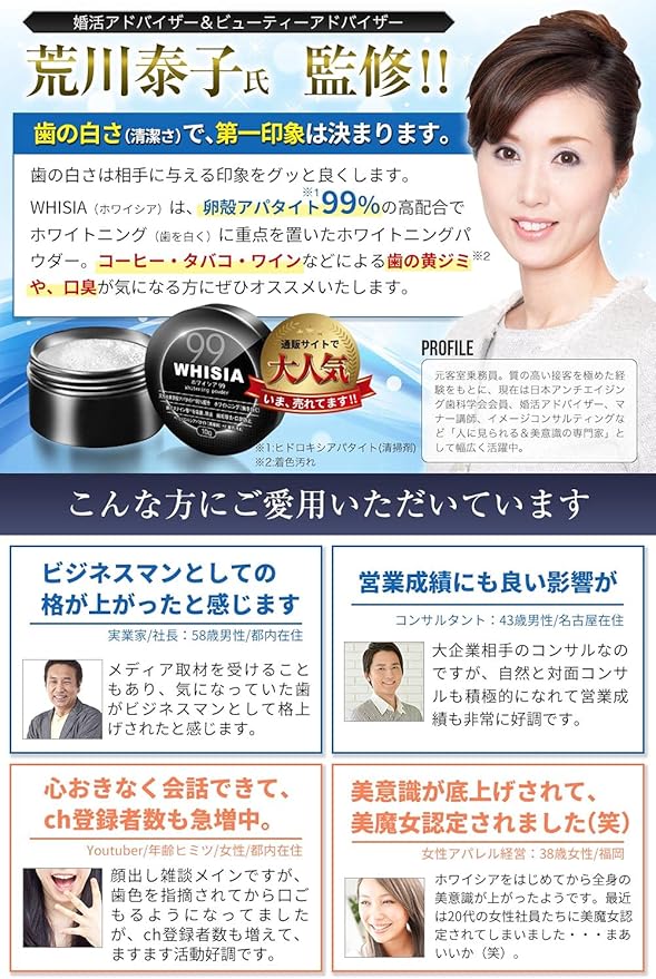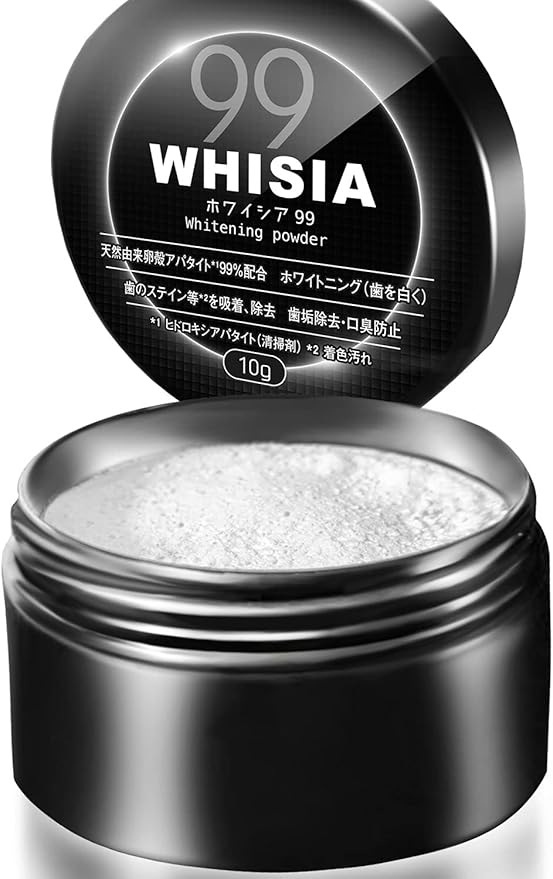 【婚活アドバイザー&ビューティーアドバイザー監修】今、美容の中で注目されているのが歯のホワイトニング(歯を白くする)歯磨き粉です。婚活アドバイザー&ビューティーアドバイザーの荒川氏の経験上、『歯の白さ』で第一印象が決まります!歯のホワイトニング(歯を白くする)歯磨き粉により容姿が美しくなり婚活も仕事も順調になる方が多いようです。歯医者でのホワイトニング(歯を白くする)が効果的ですが、自宅で簡単にホワイトニング(歯を白くする)が出来るようWHISIAが誕生しました。ホワイトニングで注目されている卵殻アパタイトを99%配合したホワイトニングパウダーで『歯を白くする』(ホワイトニング)に重点を置いた商品です。コーヒー、タバコ、ワインなどによる歯の黄ジミや口臭が気になる方におススメなホワイトニングパウダーです。 【コーヒー、タバコ、ワインはお好きですか?】歯の黄ジミや口臭の原因と言われるコーヒー、タバコ、ワインなどがお好きな方に是非ホワイトニングパウダー歯磨き粉をお使い頂きたいです。WHISIAは卵殻アパタイト99%配合で『ホワイトニング』(歯を白くする)で大注目のはみがき粉です。朝晩2回の簡単な歯のセルフホワイトニング(ホームホワイトニング)歯磨き粉です。WHISIAで歯の新・美白習慣! 【ホワイトニング(歯を白くする)】男女問わず、年齢もお子様から年配の方まで美容の中でホワイトニング(歯を白くする)が大注目です。時間のある方は歯医者さんでホワイトニングを、時間の無い方は自宅でセルフホワイトニング(ホームホワイトニング)をされている方が多いです。ホワイトニング(歯を白くする)をすることにより美意識が高くなり笑顔が増えるとも言われます。自宅でホワイトニング(歯を白くする)はみがき粉でオーラル ケアをお勧めします。アパタイトが黄ばみや汚れ・歯石を吸着して落とします。