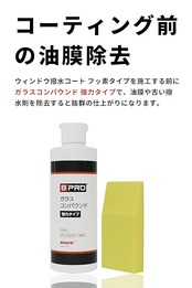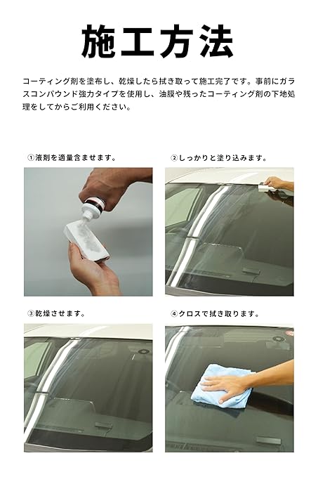 施工方法:コーティング剤を塗布し、乾燥したら拭き取って施工完了です。事前にガラスコンパウンド強力タイプを使用し、油膜や残ったコーティング剤の下地処理をしてからご利用ください。