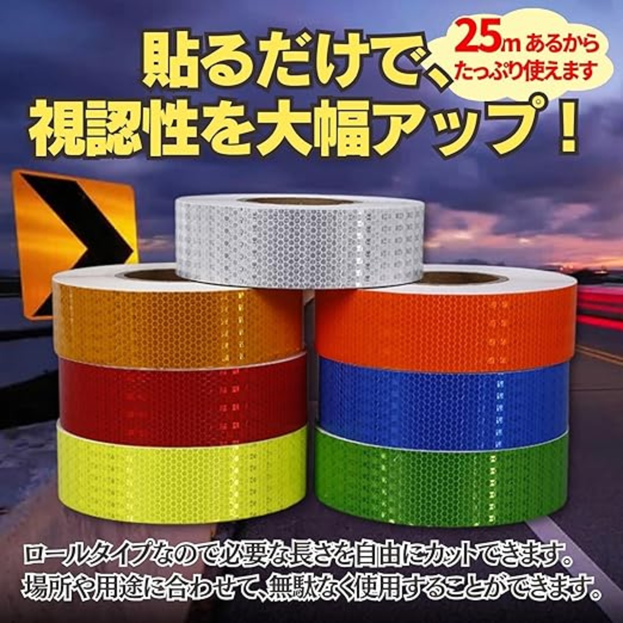 夜間の事故リスクを激減!反射テープで大切な人を守ろう! ✅ 工事現場や駐車場の安全対策に最適! 50mm幅25mの長尺反射テープは、広範囲を明るく照らすため、夜間の視認性を大幅に向上させます。工事現場や駐車場の安全対策はもちろん、夜間のジョギングや愛車の安全対策にも最適です。