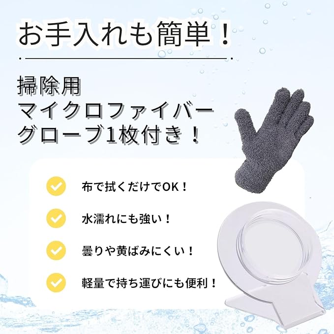 ホコリや汚れも布で拭くだけで綺麗になるので、お手入れも簡単!水濡れにも強く、曇りや黄ばみにくい!お掃除用のマイクロファイバーグローブ1枚付きなので、特別な洗剤等も不要でお掃除も楽々に行えます。