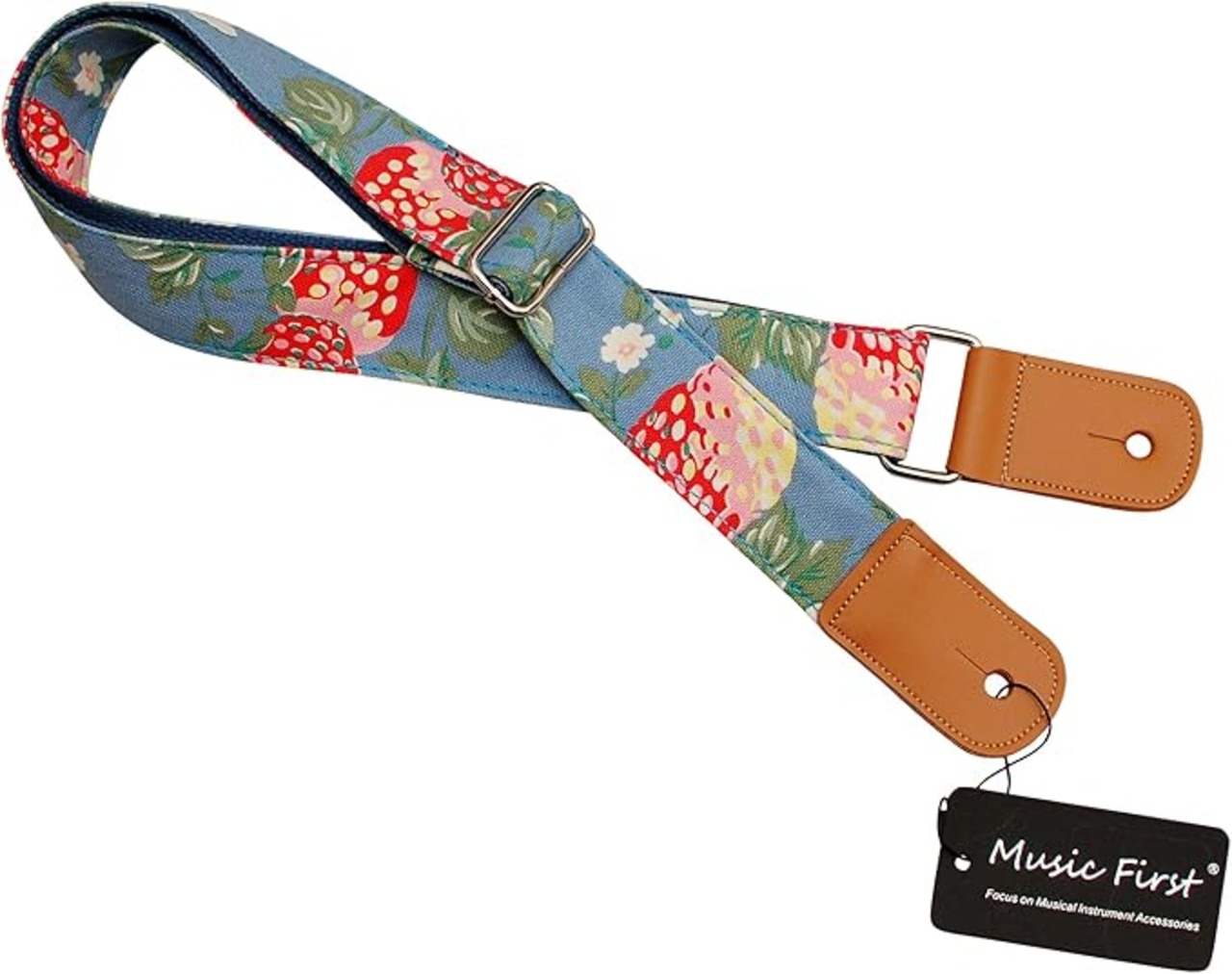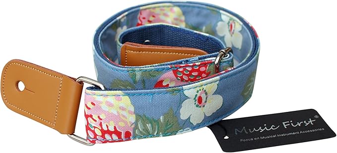 MUSIC FIRSTオリジナルデザインMUSIC FIRST「苺の花」ソフトコットンウクレレストラップウクレレショルダーストラップ / ビンテージスタイルライトブルーイチゴの花の模様。 / 素材:コットン(外側)+本革+コットン(内側)+ 金属部品 / 幅:1.5インチ(3.8センチメートル), 長さ:48inch〜27.5inch調整可能(70〜122センチメートル) / 一つの黄金色のストラップの爪として無料プレゼント